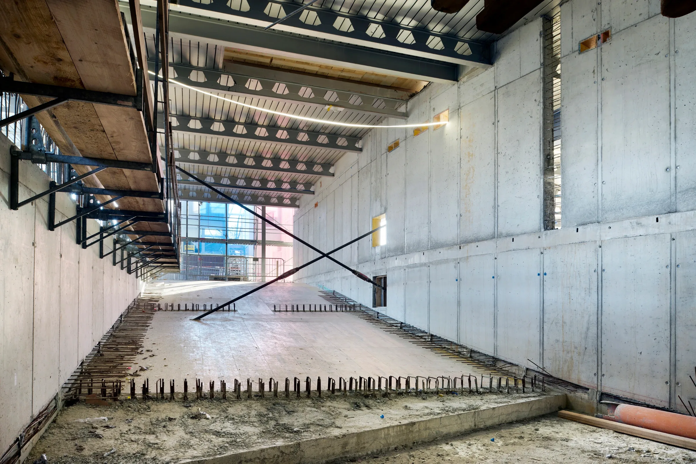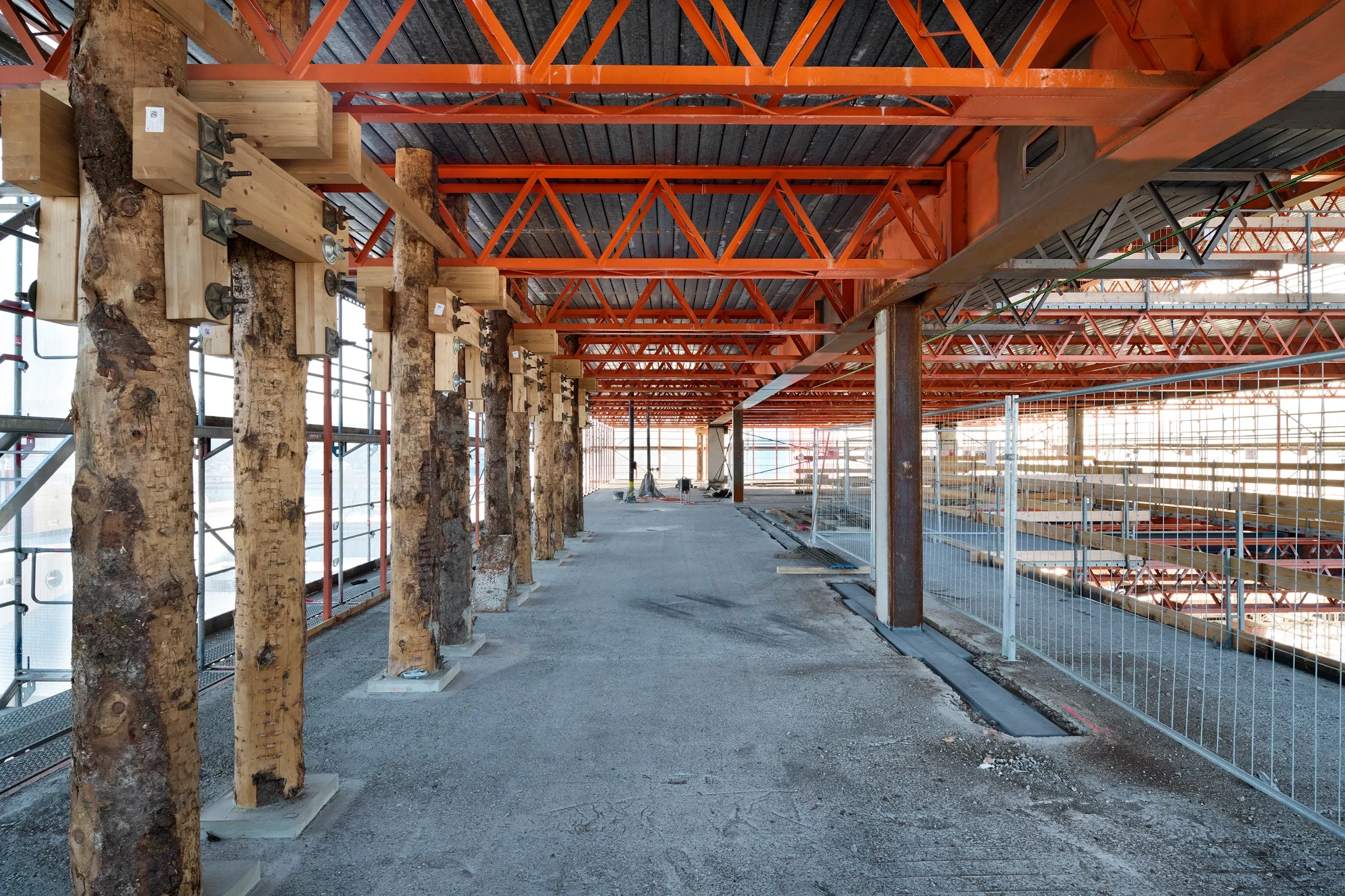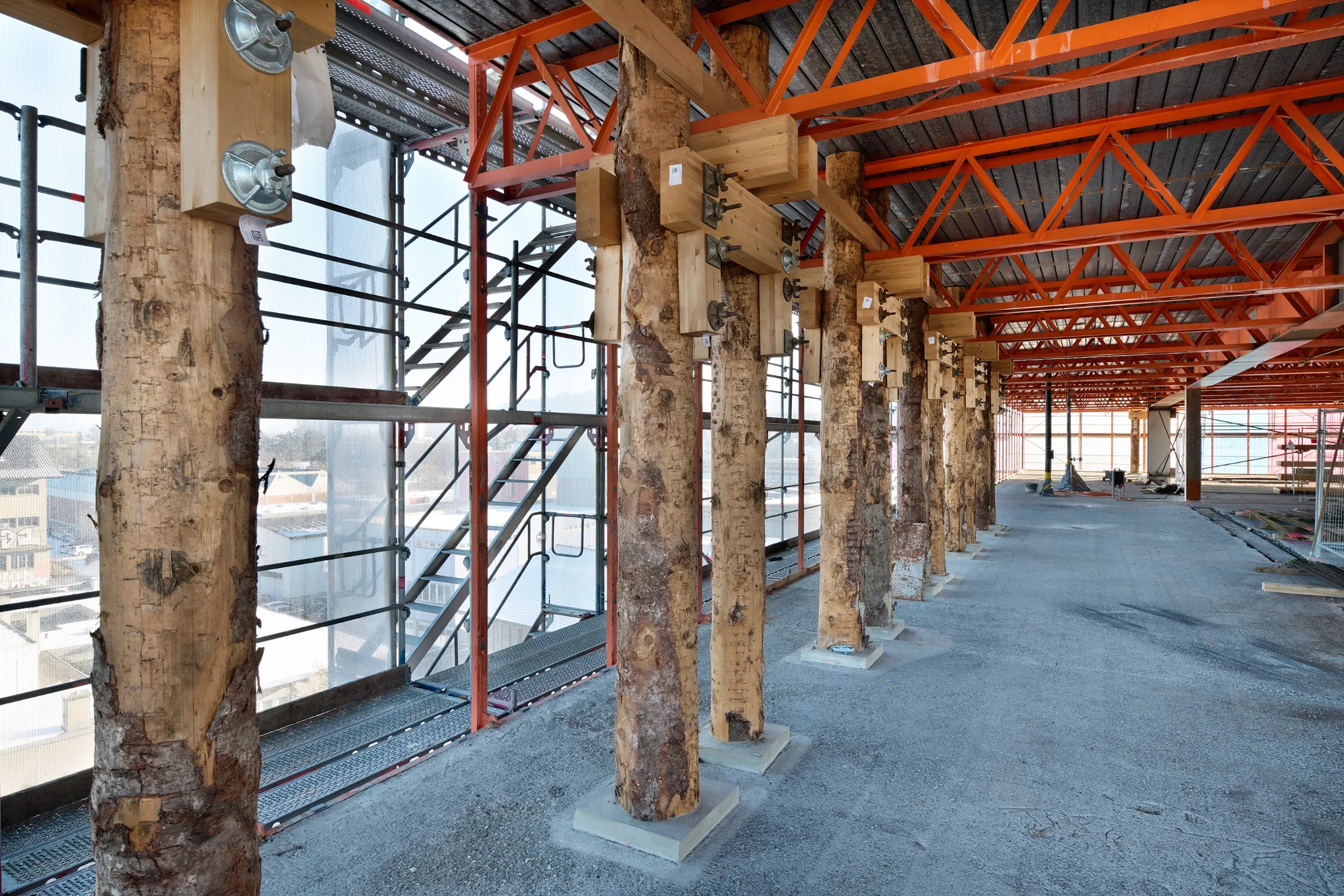 Die Aufstockungen mit Wohnungen auf dem Sockel im Norden und im Westen sind als Holzkonstruktion vorgesehen, sowohl Aussenwände als auch Innenwände und Decken.