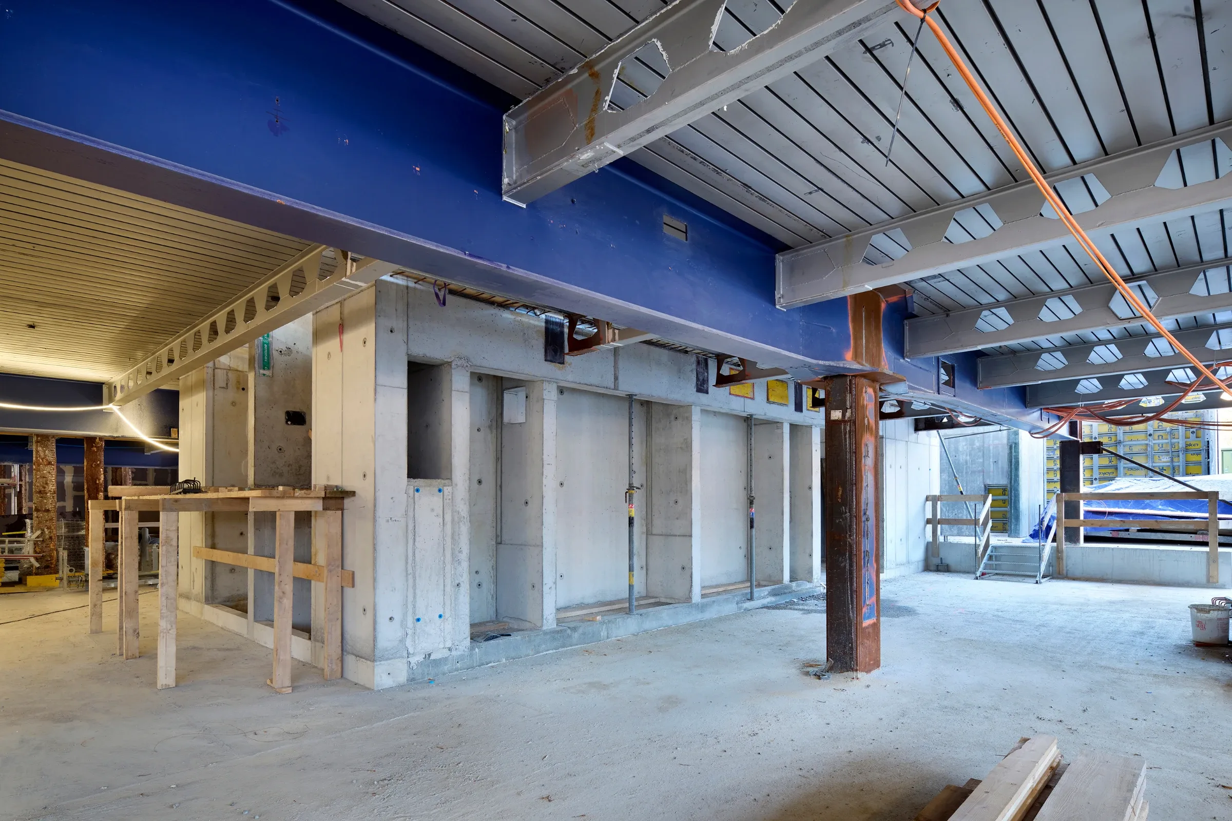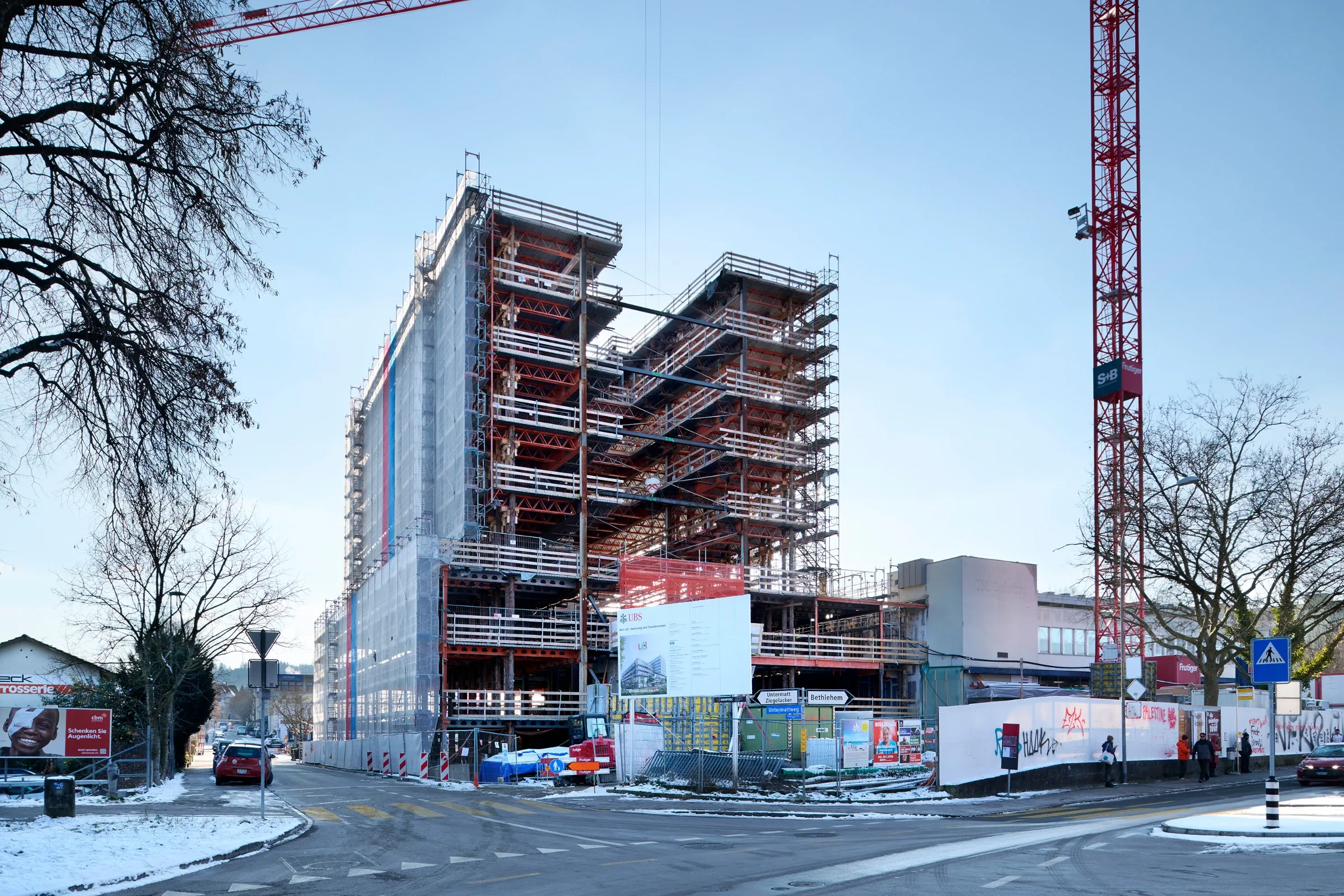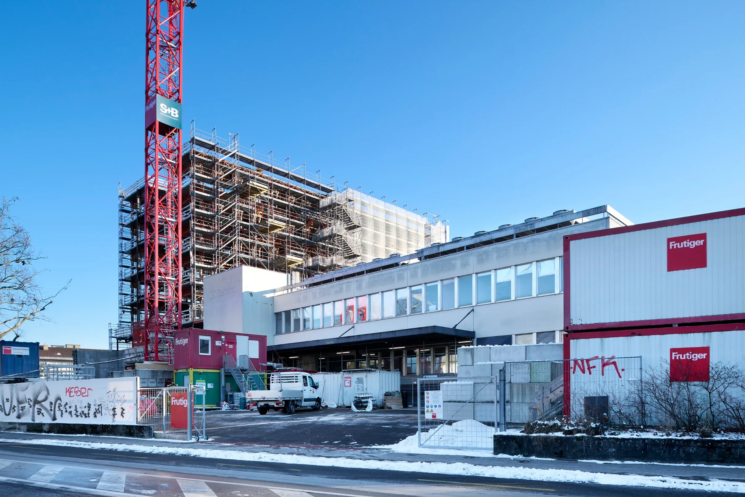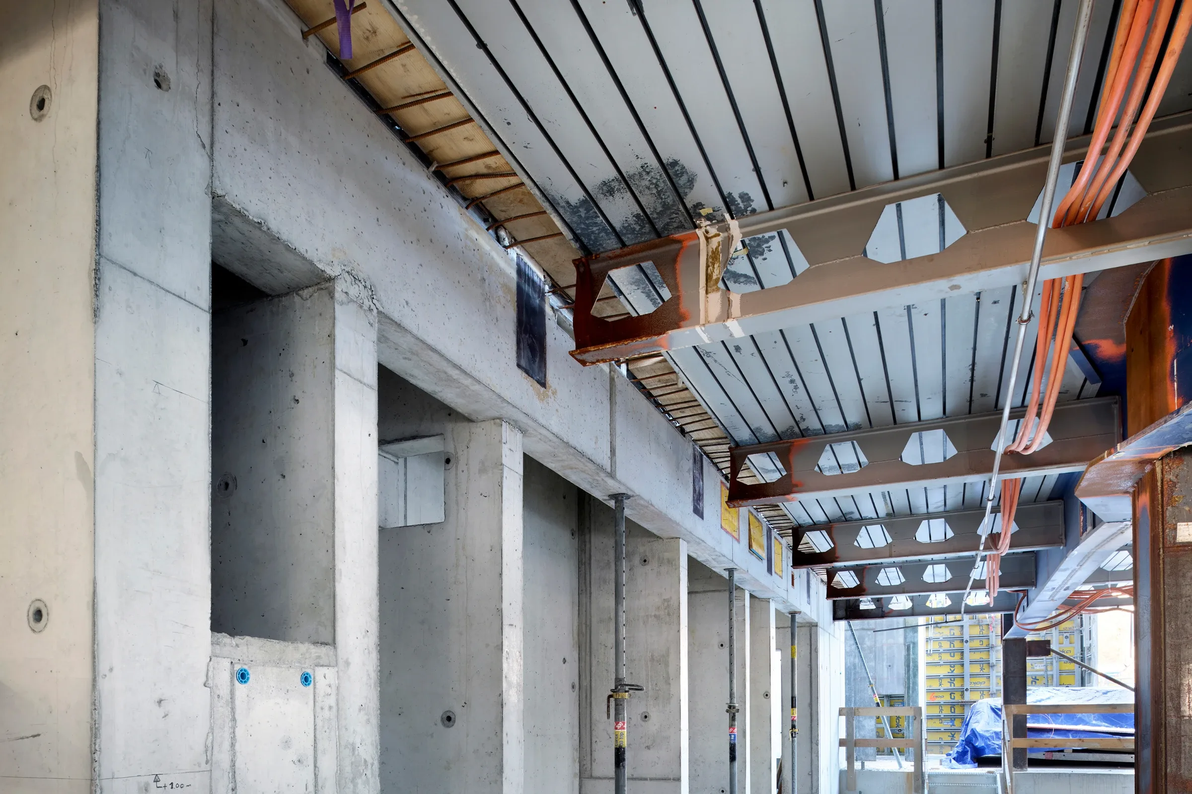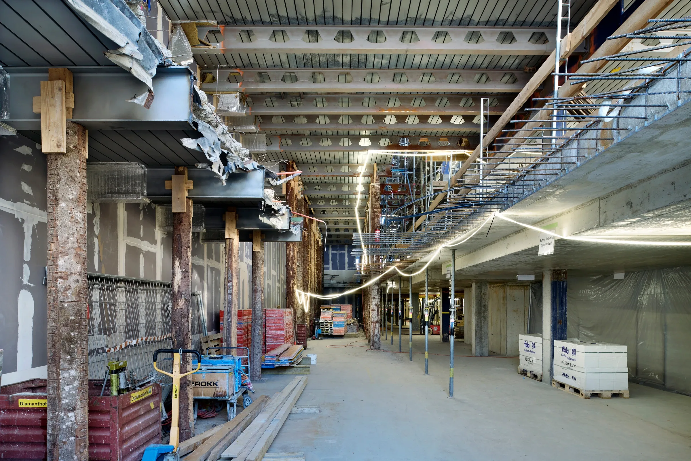 Das heutige Gebäude wird bis auf die bestehende Tragstruktur zurückgebaut und anschliessend neu aufgebaut. Dank der bestehenden Tragstruktur aus massiven Untergeschossen und Stahlstützen, Stahlträgern und Blech-Betonverbunddecken müssen keine neuen Bauteile hergestellt werden. So werden die CO2-Emissionen reduziert.