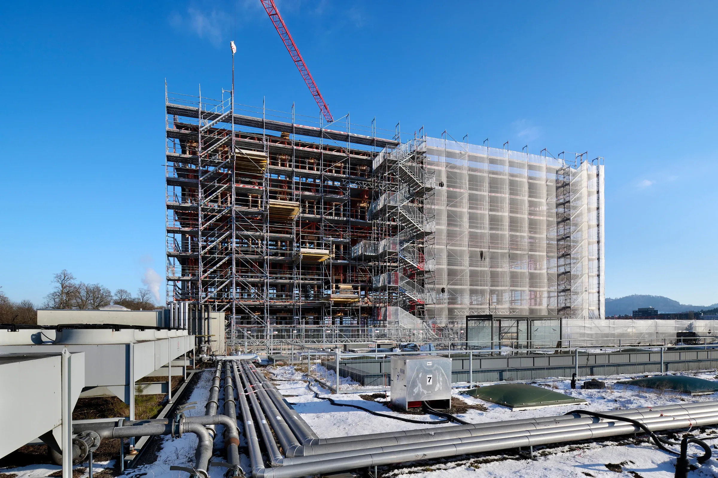 Statt für die Lüftungsanlagen des Bürogebäudes im Untergeschoss eine bauliche Erweiterung vorzunehmen, werden sie neu auf dem Dach installiert.