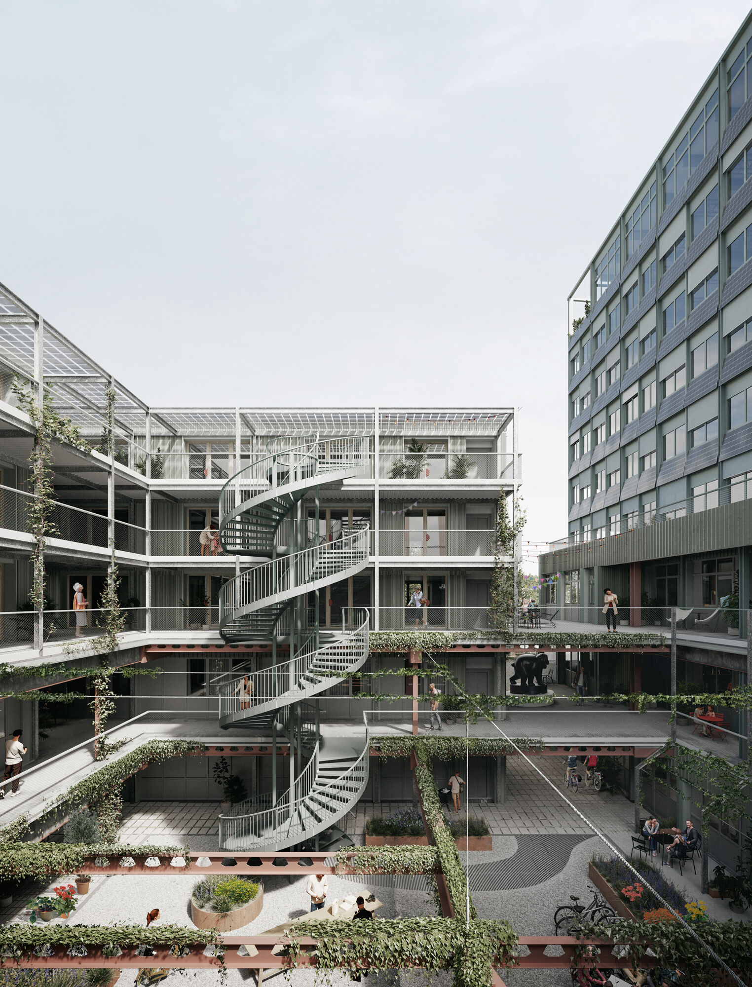 Stahlkonstruktionen, wie die Tragstruktur des Laubengangs, sind besonders geeignet für verschraubte Verbindungen. Zudem wird mit vorfabrizierten Elementen gearbeitet, die als Böden in die Stahlkonstruktion eingelegt werden, anstatt sie vor Ort zu betonieren.